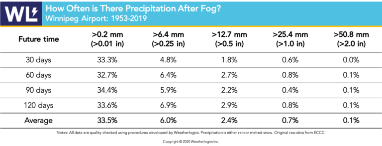 This is actually a very easy thing to check. We simply identify all days with fog, then check how many had rain 90 days later. However, it’s actually not so simple. For one, the 90-day rule varies by person. Some say 60 days, some say 80-90 days, some say 90-100 days, so which is it? Also, what is considered rain? Most people interpret this to mean a significant storm, but what qualifies? Is 10 mm a big storm, or 20 mm, or 50 mm? Or does this mean any amount of rain? The uncertainty in the criteria is probably part of the reason this formula seems to work.
